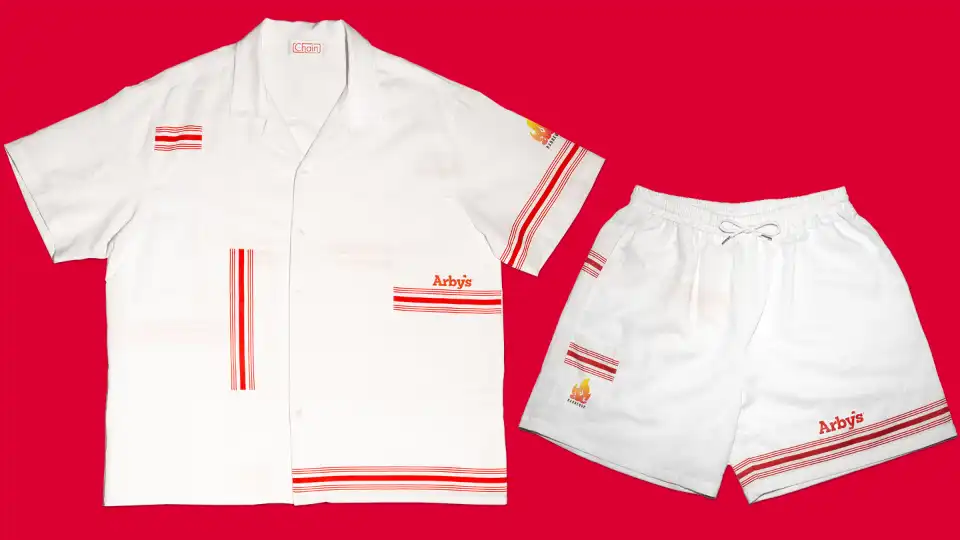 The outfit was designed in collaboration with the Chain brand. Both the shirt and shorts are white (because what fun is it to drop sauce on an outfit that won’t let you revel in the mess?), with red stripes and, natch, the Arby’s logo.